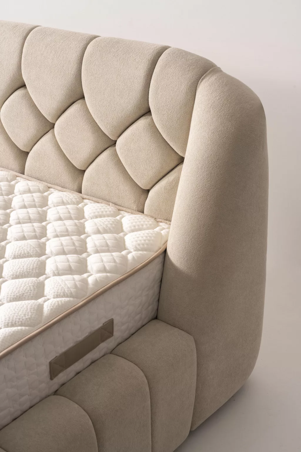 Az ágy nemcsak esztétikai szempontból kiemelkedő, hanem funkcionálisan is rendkívül átgondolt. A beépített ágyneműtartó diszkréten illeszkedik a szerkezetbe, így segít fenntartani a hálószoba rendezettségét anélkül, hogy megtörné az ágy letisztult megjelenését.