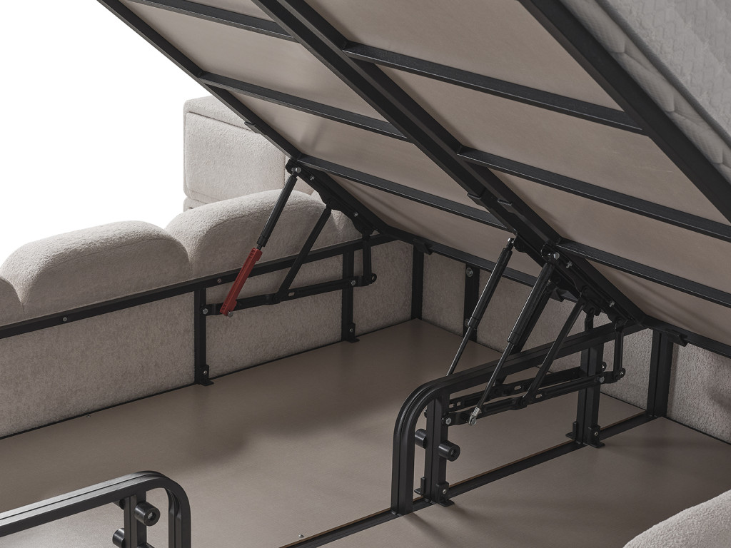 A hosszanti oldal vonalában ágyneműtartóval rendelkező Luxury ágykeretünk egy extra tárolási lehetőséggel rendelkezik, miközben biztonsággal nyitható és zárható.