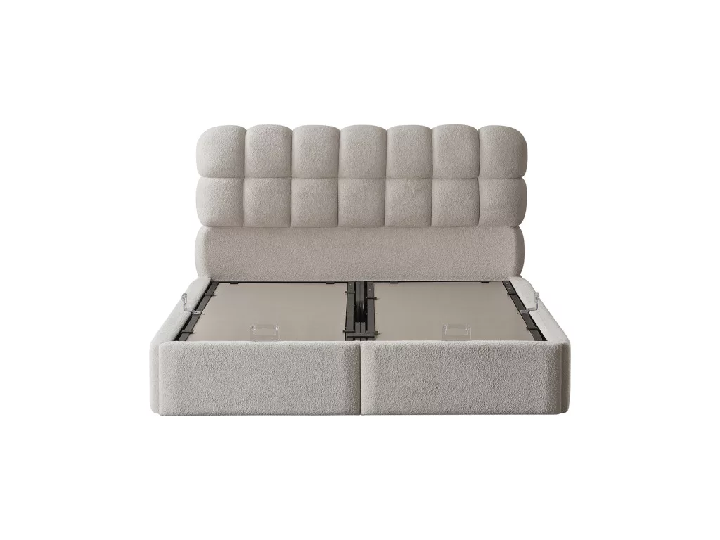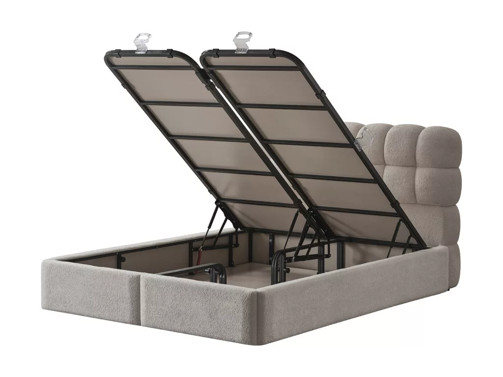A kialakítás a helytakarékosságot is szem előtt tartja. A beépített ágyneműtartó diszkréten rejtve marad, miközben értékes tárolóhelyet biztosít.