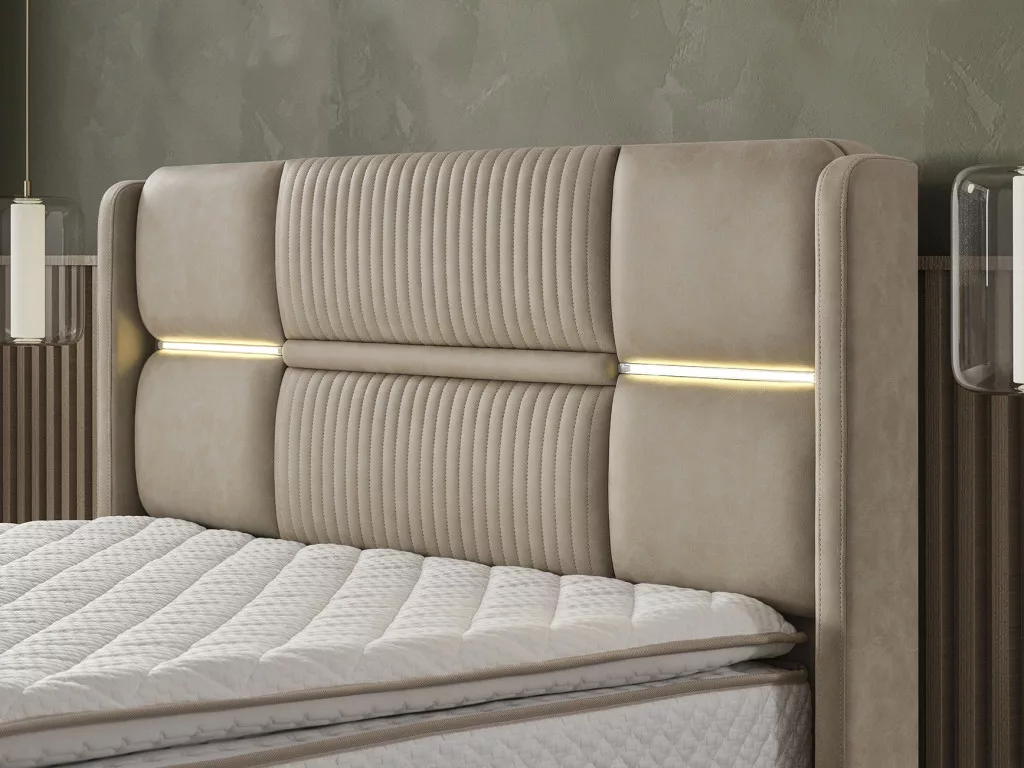 A modell központi eleme a markáns, geometrikus kialakítású fejtámla, amely modern karaktert ad az ágynak. A függőleges steppelés és a letisztult panelezés harmonikus ritmust teremt, míg az integrált, diszkrét fénycsíkok különleges hangulatot kölcsönöznek a térnek.