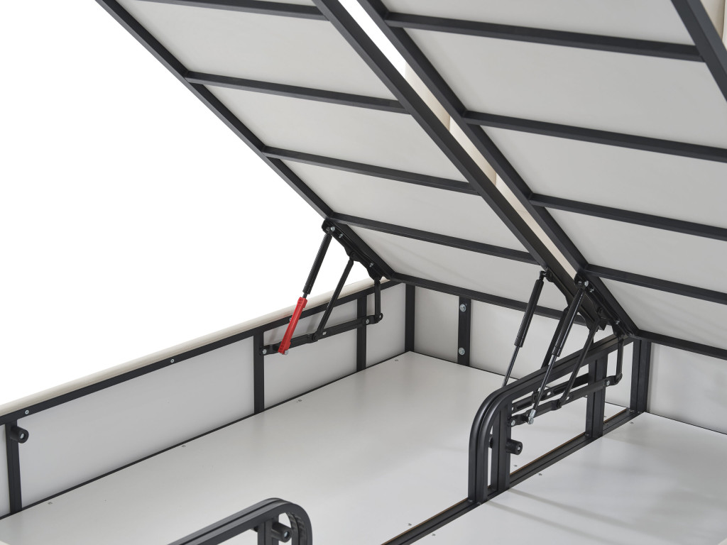 A hosszanti oldal vonalában ágyneműtartóval rendelkező RELAX ágykeretünk egy extra tárolási lehetőséggel rendelkezik, miközben biztonsággal nyitható és zárható.