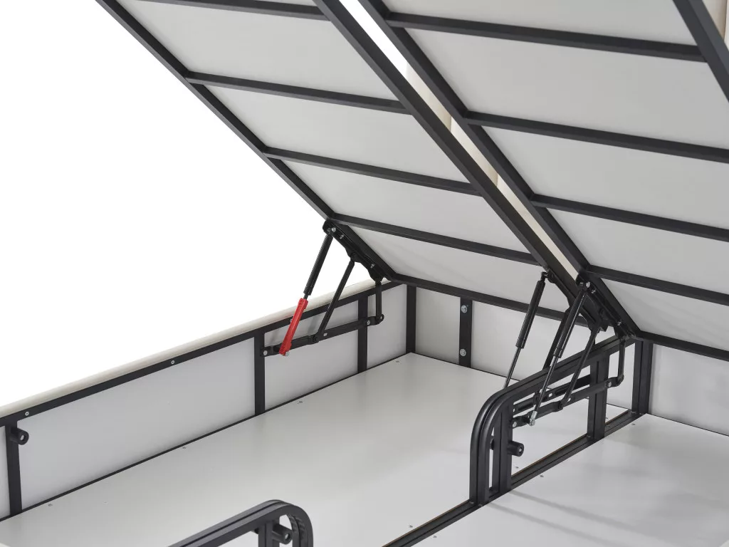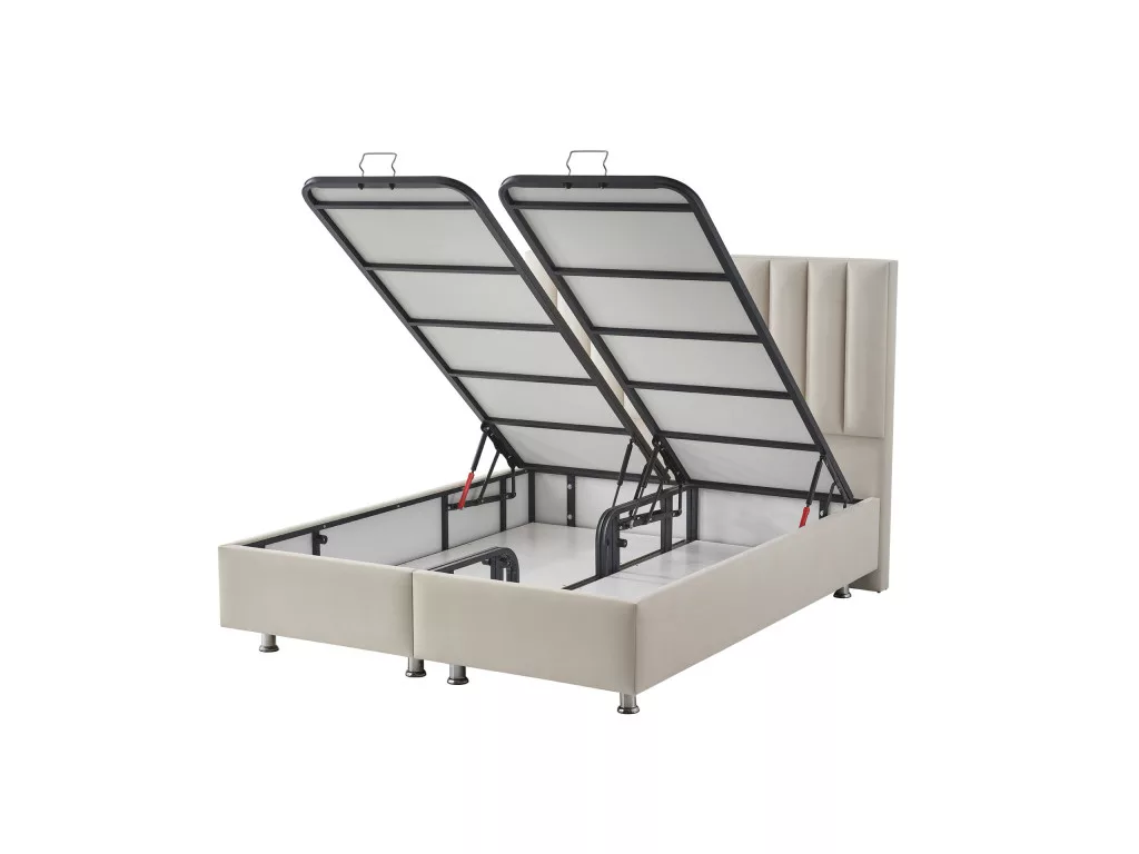 Az ágy egyik legnagyobb előnye a beépített ágyneműtartó, amely kiváló megoldást kínál akár kisebb hálószobák esetén is. A gázrugós emelőszerkezet segítségével az ágyrács könnyedén felnyitható, így a tárolórekesz egyszerűen és biztonságosan hozzáférhető.