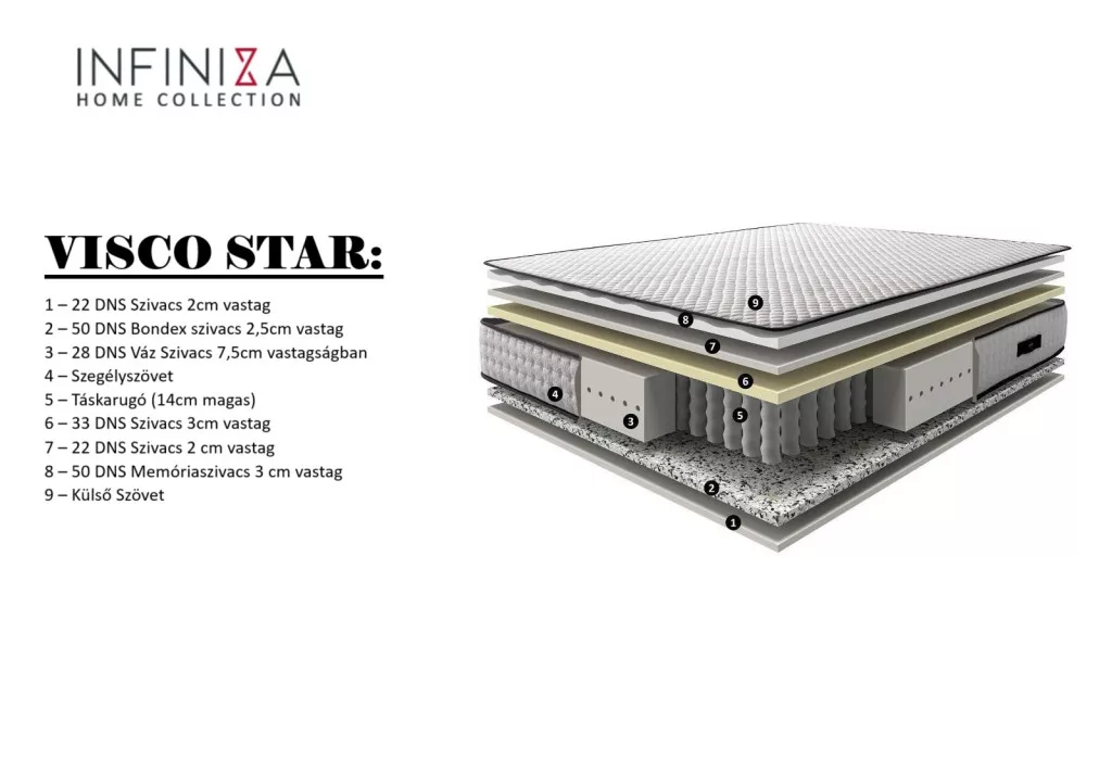 Az INFINIZA VISCO STAR ideális választás mindazok számára, akik a modern memóriahabos komfortot és a stabil táskarugós alátámasztást egyszerre keresik.