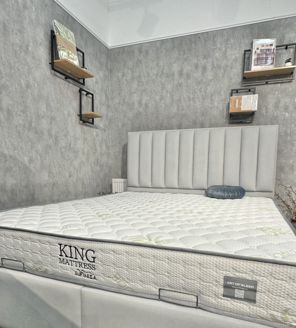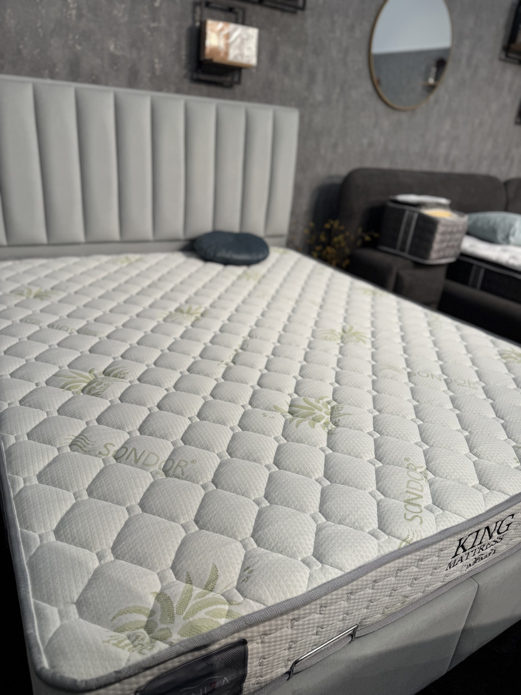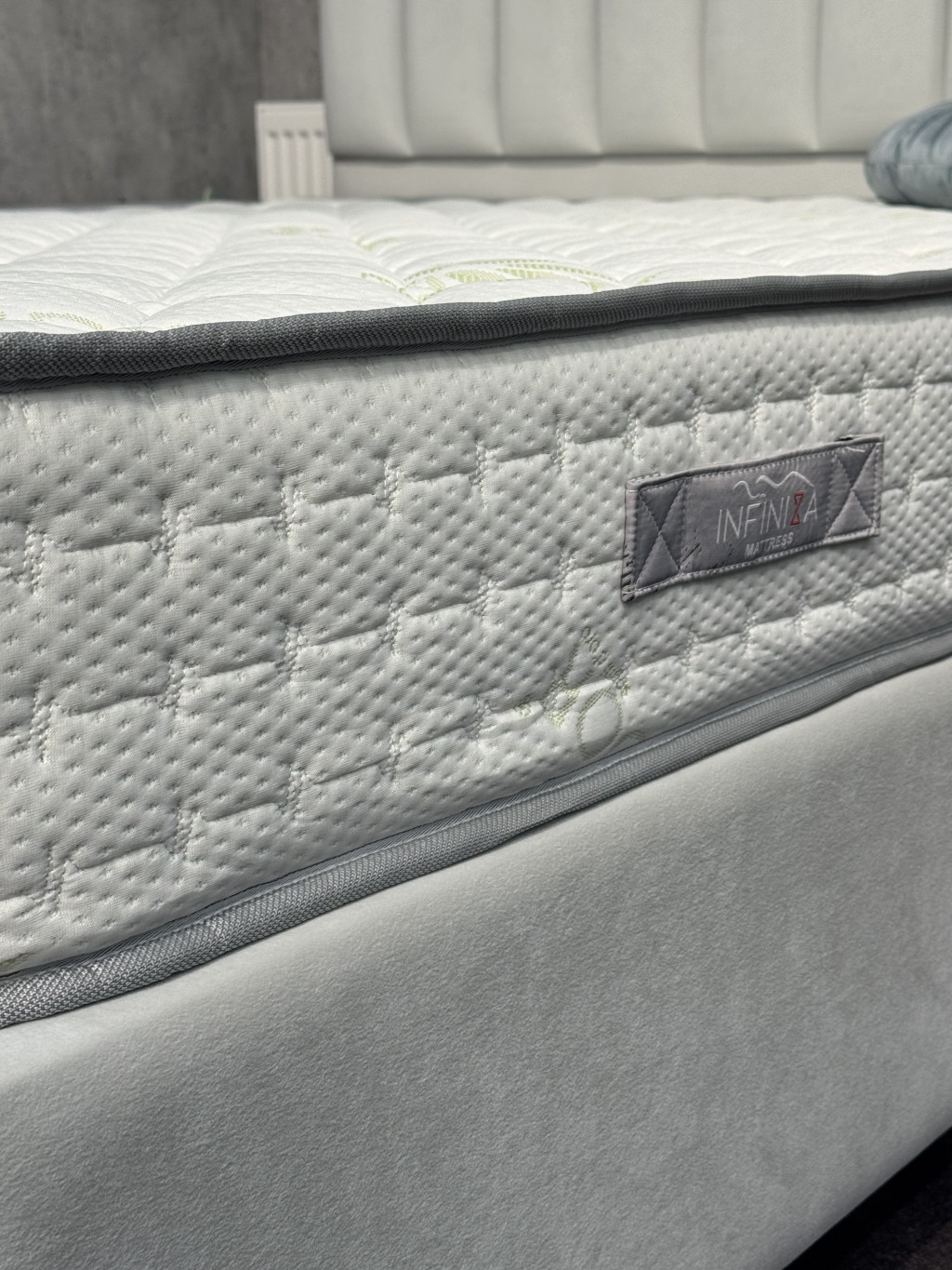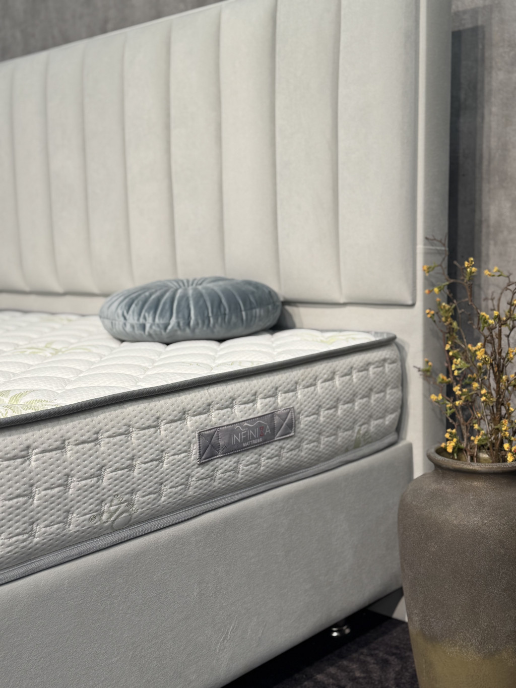A 25 cm magas Infiniza Szállodai King matrac félkemény, melyet kifejezetten a szállodáknak terveztek. Ez a luxus kategóriába tartozó matrac aloe verával van átitatva, amely hozzájárul a nyugodt és pihentető alváshoz, miközben a bőrt is ápolja. A 7 zónás zsákrugós rendszere úgy van kialakítva, hogy hét különböző ponton biztosítsa a megfelelő támaszt, így optimalizálva a vendégek testtartását és kényelmét. Minden négyzetméteren 300 darab táskarugó található, amelyek egyenként reagálnak a test nyomására, biztosítva ezzel a lehető legjobb alátámasztást.
